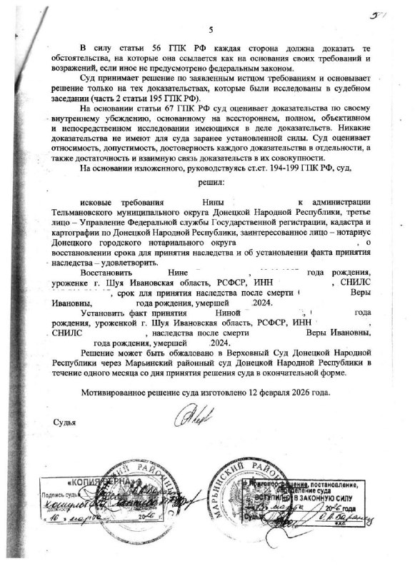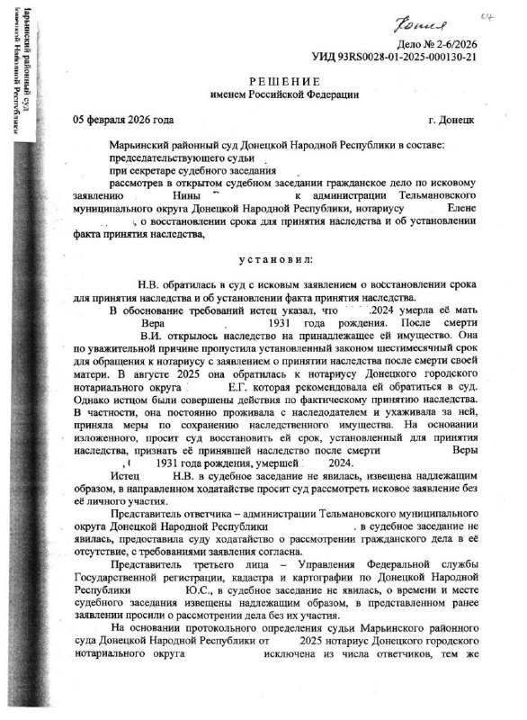 Благодаря нашей работе, в феврале 2026 года Марьинский районный суд Донецкой Народной Республики вынес справедливое решение: срок для принятия наследства был восстановлен, а факт его принятия установлен.