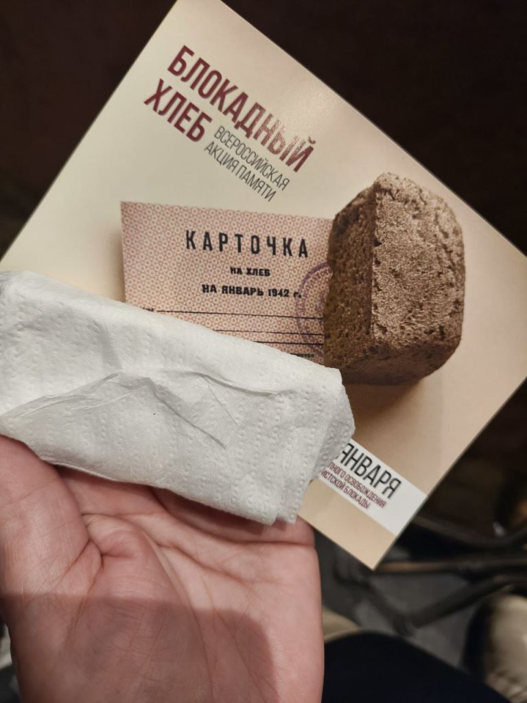 Литературно-музыкальная композиция «Подвиг Ленинграда», об истории блокады, ее значении для России и всего мира, закончилась минутой молчания. Каждому участнику был выдан «блокадный кусочек хлеба» весом около 125 г. В тяжелейших условиях в Ленинграде людям приходилось работать, сражаться и вести повседневную жизнь, испытывая чувство голода постоянно. И именно кусочек хлеба, вес которого составлял всего 125 г., стал символом блокады, а также символом жизни и надежды.
