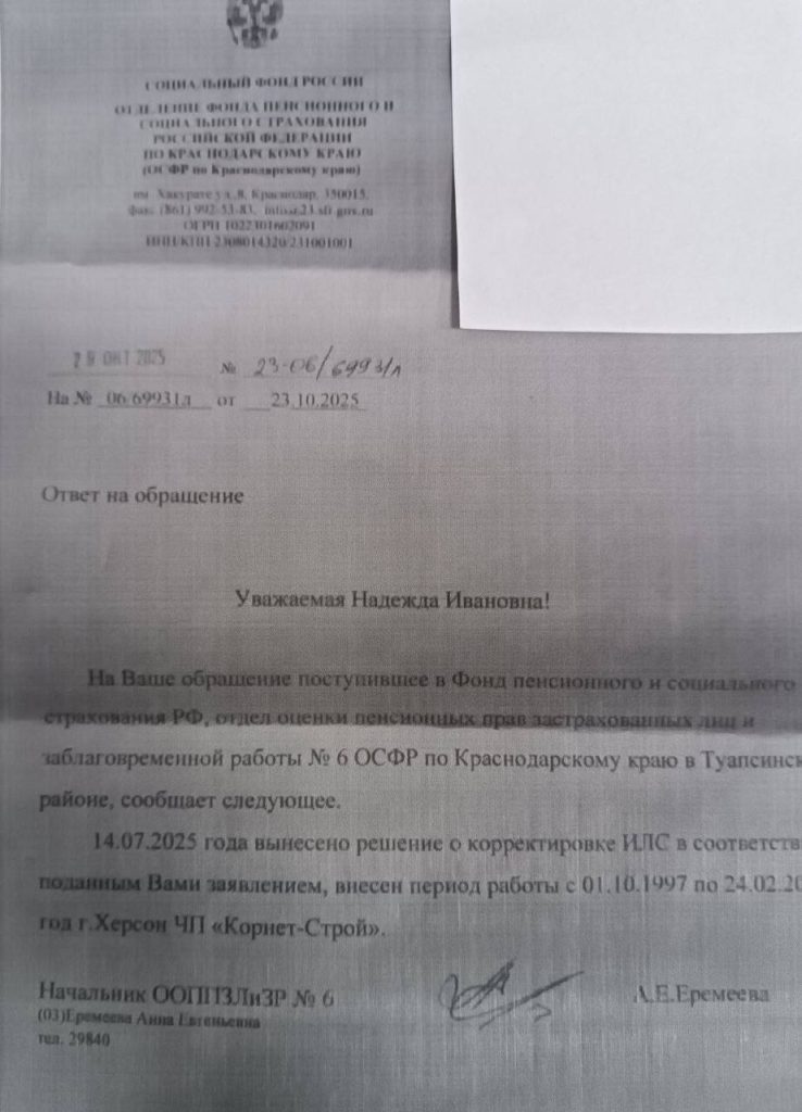 В Краснодарский Центр помощи Украинским переселенцам обратилась гражданка Ю., переселенка из г. Херсон (ХО). Она столкнулась с несправедливым отказом Пенсионного фонда включить часть ее трудового стажа в индивидуальный лицевой счет (ИЛС) из-за отсутствия записи об увольнении.