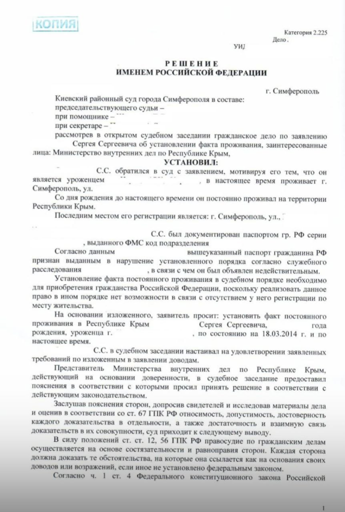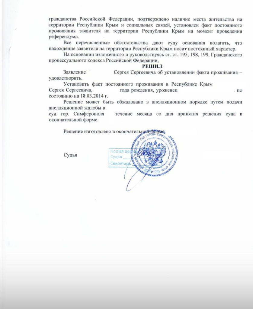 Благодаря профессионализму и настойчивости специалистов Центра, суд удовлетворил заявление Сергея и установил факт его постоянного проживания в Крыму. Это стало ключевым шагом к восстановлению гражданства РФ.