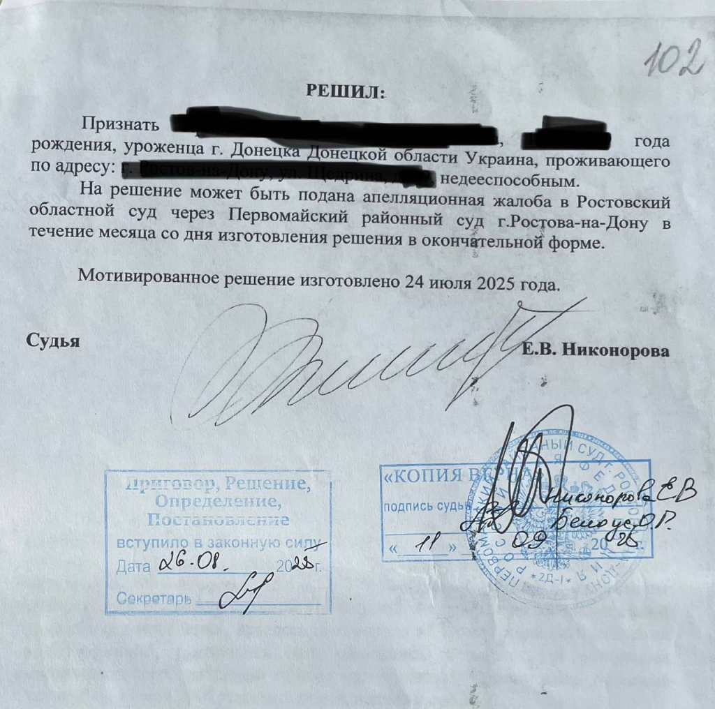 В Центр поддержки переселенцев в г.Ростове-на-Дону обратилась гражданка Б., переселенка из г.Донецка, по вопросу признания ее сына недееспособным ввиду стойкого психического заболевания с детства.